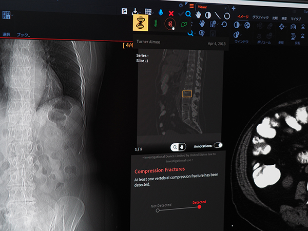 ITEM2019のトレンドともなったAIへの取り組みとしては,RSNA2018でも紹介したゼブラ・メディカル・ビジョン(ゼブラ社)のAIエンジンのVue PACSへの統合,自社開発の病変管理機能(Lesion Management)やCTの脊椎自動ラベリングなどを紹介した(すべてW.I.P.)。