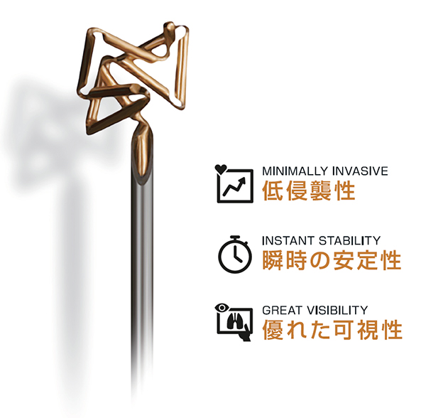 『Gold Anchorマーカ™』は,刺入針を用いて体内臓器に留置する放射線治療時の病変識別マーカです。植込みするマーカは,挿入時に標的となる腫瘍組織および腫瘍組織近傍に合わせて,その形状を自在に変えることができ,組織細胞への付着性に優れているため,位置ずれが生じにくい製品となっています。また,Gold Anchorマーカは,挿入に使用するニードル経が小さいため,マーカ留置時の出血・感染のリスクが少なく,患者への負担を減らすことが可能です。