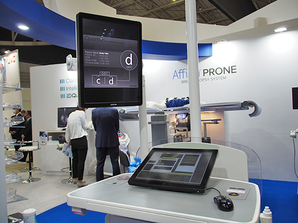 ブースでは,ユニバーサルコンソール上で乳房構成の解析が可能な乳腺密度評価ソフトウエア“Quantra 2.2”も紹介。BI-RADS 5th editionに対応し,乳房構成の解析結果をa〜dで表示する。解析結果は,PACSへ画像を送信する際にセカンダリキャプチャとして自動送信するほか,撮影したその場で解析してコンソールに表示することもできる。