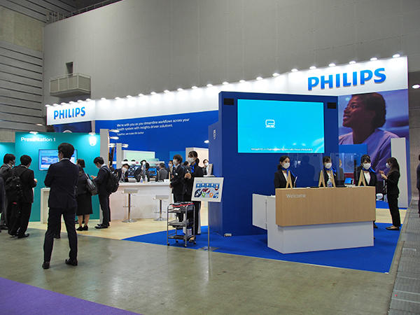 フィリップス・ジャパンは,“Together, we make life better”をテーマに掲げ,感染対策のためにモニタでのプレゼンテーションを中心に展示を構成した。展示内容もImage Guided Therapy(IGT),CT,MRI,ヘルスケアIT,超音波診断装置にポイントを絞り,人工知能(AI)などの最新技術を活用し,医療従事者と患者の負担軽減や病院経営に資するソリューションをアピールした。
