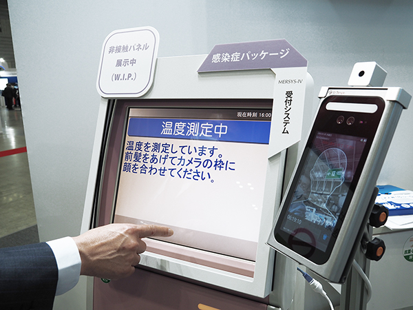 また,新型コロナウイルス対策としては,問診受付システム「MERSYS-Ⅳ(感染症パッケージ)」に画面に非接触パネルを装着することで非接触での操作が可能になるほか,自動検温装置を併設することで,来院患者に安心を提供可能なことがアピールされた。