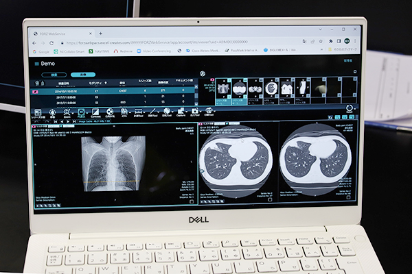 昨年のITEM2021で発表されたFORZの画像システムのWebビューワも最新バージョンを展示した。Webビューワは,院内サーバに電子カルテの端末などからアクセスしたいという要望に対応してWebブラウザで参照を可能にしたものだが,今回の展示では計測などの機能が強化されアプリケーション版のビューワと同等の機能を備えていることをアピールした。同社では子会社のAIメディカル(株)で遠隔読影サービスを提供しているが,今後,遠隔読影サービスでのブラウザ版の利用や,PACSのクラウド化,院外からのデータ参照といった要望にも応えていく予定だ。