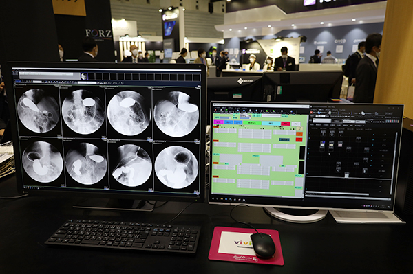 FORZシリーズには,PACS(画像),RIS(放射線),レポート,検体検査システム(LIS),健診システムなどの部門システムがラインアップされており,医療機関のニーズに合わせて必要なシステムを選択して導入し,統合システムとして運用できる。運用での核となるのが部門情報統合表示画面“Line-View”だ。Line-Viewでは,各部門システムのデータ(検査結果)を患者ごと(ID単位)に時系列でサムネイル表示し,全体の検査履歴を俯瞰して把握できる。FORZの「マルチモダリティPACS」のDICOM,非DICOMデータ(JPEGなどの汎用画像データ,スキャンデータ,文書ファイルなど),他の医療機関からの紹介状や検査画像などを患者IDに紐付けて一元管理できる。FORZの検体検査システムのデータや健診結果なども同一画面のタイムライン上で表示でき,患者情報を一覧で把握した診療をサポートする。マルチモダリティPACSは,電子カルテから自動連携やキー画像の貼り付けなど連携機能や,ショートカットキーなどを使った操作の効率性なども特徴だ。また,レポートシステムは,画像システムと連携した入力支援の機能や健診施設向けの専用機能,内視鏡レポート向けなど,検査種別や施設の規模や運用に合わせた柔軟なシステムを提供できる。入力画面と印刷用の帳票のレイアウトをそれぞれに用意して,入力しやすく見やすいレポートシステムを構築できる。展示では,上部消化管撮影の画像と検診データの読影にカスタマイズされたレポートを組み合わせた健診施設向けの端末構成を紹介した。健診では,大量の検査データに対して正確に効率良く業務を行うことが重要となるが,健診の読影向けに異常なしの所見が“次へ”ボタンをクリックするだけで入力されるようにして,手間を省き読影時間を短縮できることを紹介していた。