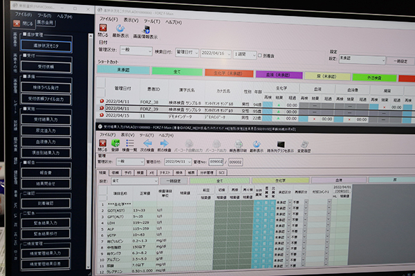 検査システム(LIS)は,検体検査装置や外注検査のデータを管理でき,リアルタイム進捗管理“進捗モニター”による検査値のリアルタイムでの把握や依頼や結果報告の状況の把握などを可能にする。FORZの統合システムとリンクすることで,Line-Viewでの検査結果表示などが可能だ。