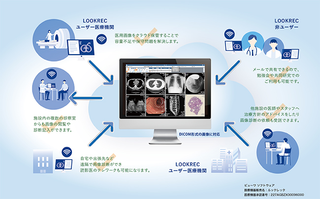 遠隔画像診断のために開発されたLOOKRECは「ためる」,「見る」,「記録する」,といった機能に加えてクラウドならではの「共有,連携」機能があります。テレワーク導入・共同研究・症例検討会・病病連携など,既存製品のユースケースと,AI連携,3Dビューワーや医師間コラボレーションのための新製品といった開発の成果を展示します。開発に携わった医師やエンジニアもブースに滞在し来場者の皆様と意見交換ができる体制でお待ちしております。
