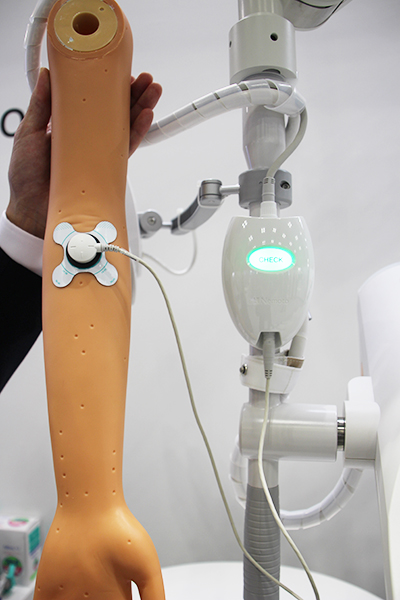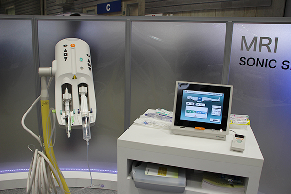 さらに,検査の安全性を高めるオプションとして,「CEエビデンスシステム」「圧力監視モニター」「造影剤モレ検知サポートシステムLD」が紹介された。造影検査情報管理システムであるCEエビデンスシステムは,RISから患者情報を取得し,事前に確認すべき過去の副作用履歴や腎機能測定値などを注入器のコンソールに表示することで,造影剤投与前の安全確認をサポートとする。検査後には,造影投与情報を画像化してPACSに送信するため,検査情報の一元管理も可能となる。なお,CEエビデンスシステムは,MRI用注入器SONIC SHOT 7にも対応している。圧力監視モニターは,注入器本体に装着するヘッドディスプレイで,操作室で設定した注入プロトコールを撮影室側で確認することができ,注入時には圧力グラフを表示する。造影剤モレ検知サポートシステムLDは,センサーから照射される近赤外線により造影剤の漏出を検知できるほか,注入器と連動させることで,異常を検知した場合は注入を自動停止することもできる。これら3つのオプションは,現在議論されているタスク・シフティングにおいて,安全性の確保に貢献する製品となっている。