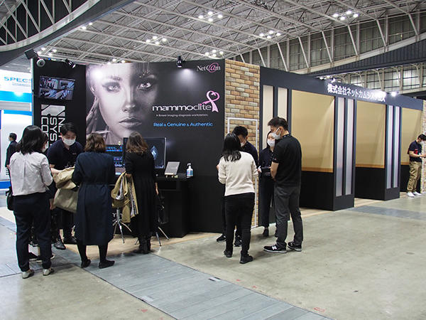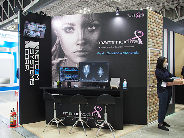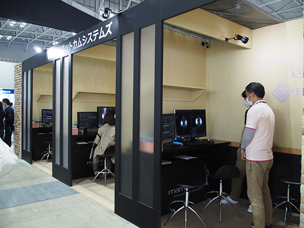 ネットカムシステムズは,展示ホールDの大きな通路に面した位置にブースを構え,ゲートから入場する来場者の視線を集めるブースデザインで,乳腺画像診断ワークステーション「mammodite(マンモディーテ)」をアピールした。ブースには個室タイプの展示スペースを3室用意し,感染防止対策をとりながら,実機を使ってmammoditeの最大の特長である表示スピードや直感的な操作性をデモンストレーションした。今回もEIZO,バルコ,JVCケンウッドの協力を得て,12メガピクセルモニタ(各社1台)とスタンダードな5メガピクセルモニタ2面構成(EIZO)を配置し,各社のモニタに対応していることをアピールした。今回の展示では,mammoditeの高い基本性能に加え,最新アップデートで追加された新機能や開発中の機能の紹介が行われた。