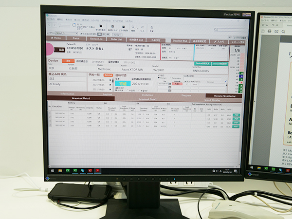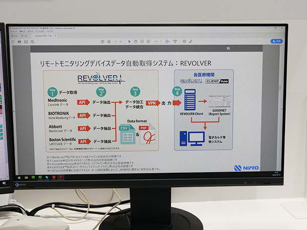 今回のITEMで初めて紹介したのが,リモートモニタリングデバイスデータ自動取得システムのREVOLVERだ。診療報酬では,「心臓ペースメーカー指導管理料」において遠隔モニタリングによる指導・管理を行った場合に算定できる「遠隔モニタリング加算」が設けられている。2022年度の診療報酬改定では,「ペースメーカー」は260点,「植込型除細動器又は両室ペーシング機能付き植込型除細動器」は480点を算定できることとなった。新型コロナウイルス感染症(COVID-19)の流行以降,オンライン診療をはじめとした遠隔医療が拡大し,心臓ペースメーカーの遠隔モニタリングも広がっているが,管理・指導を行うには各デバイスメーカーのサーバに接続してデータを取得しなければならず,運用が煩雑な上にマンパワーにも負荷がかかっていた。