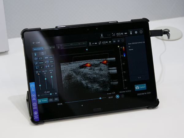 前回のITEMでも出展したモバイル超音波診断装置ECHOMOは,ワイヤレスプローブ「ECM-LP-01」と専用のAndroidタブレット「ECM-TB-01」で構成される。撮像モードは,Bモード,カラードプラが可能である。ECM-LP-01は,7.5MHzのリニアプローブで,約171mm(H)×約53mm(W)×約27mm(D)と手に持ちやすいサイズになっており,重量も167gと軽量だ。リチウムイオンバッテリーを採用しており,3時間以上動作する。プローブに専用カプラとゲルパットを装着することで,近位部の画像とカラー表示が明瞭になり,病変を描出しやすくなる。ECM-TB-01は,15秒の高速起動が可能。10.1インチサイズ,重量が440gと小型・軽量のタブレットで,取り回しの良さが特長である。