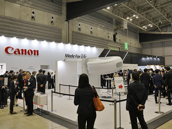 ブース入り口のエリアでは,同社の社会・環境課題への取り組みも紹介された。社会課題に対しては,ピンクリボン運動に参加して乳がん検診の啓発をサポートしているほか,小児MRI検査で鎮静剤使用を低減するためのプロジェクト,リーグワン所属のラグビーチーム「横浜キヤノンイーグルス」のオフィシャルパートナーとしてスポーツ医療・整形外科領域に貢献するといった取り組みを展開している。また,環境課題の取り組みとしては,グループ全体でスローガン「Minimum Energy 360」を掲げ,さまざまな場面において省エネ・省資源を推進していることを紹介した。