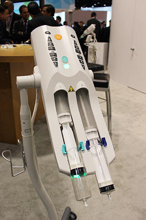 また,海外向けにデュアルヘッドタイプCTインジェクタ用「VD injector」(FDA未承認)のプロトタイプを展示。VDポンプは,心筋負荷検査用の血管拡張剤の注入装置で,心筋負荷薬剤と造影剤,生理食塩水の連続注入を1つのプロトコールで完結させたいとの,フランスの医師からの要望で開発に取り組んでいる。将来的にDUAL SHOT alpha 7のコンソールで操作できるようにする予定。