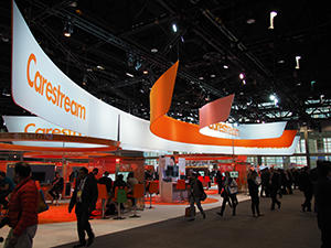Carestream Health(ケアストリームヘルス)は,South building(Hall A)にコーポレートカラーのオレンジをベースにした広大なブースを出展した。ケアストリームヘルスは,日本においては2016年春から事業をヘルスケアIT領域に集中した体制に変更したが,米国では従来と変わらず,X線診断装置やコーンビームCT,超音波画像診断装置など,モダリティを含めた放射線画像診断領域で大きな存在感を放っている。