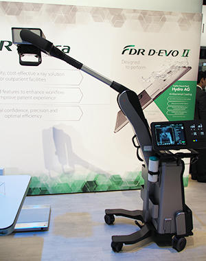 FUJIFILM Medical Systems(富士フイルム)は,X線撮影装置のコーナーで,日本で11月から発売したばかりの超軽量移動型デジタルX線撮影装置「FUJIFILM DR CALNEO AQRO」を展示した。米国での販売はまだ先だが,デジタルX線パネル(FPD)とVirtual Gridなどの画像処理技術を生かすことで,これまでの移動型X線撮影装置の仕様を見直し大幅な軽量化と新しいデザインとなった装置を一足先にアピールした。