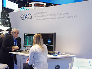 Konica Minolta Healthcare Americas, Inc.(コニカミノルタ)は,従来,米国において「ImagePilot(日本名:Unitea α)」といったクリニック向けのソリューションを提供してきた。その後,2015年のViztek買収により,米国市場におけるヘルスケアIT事業を強化。X線,超音波とともに,事業の3本柱として,市場での存在感を高めている。画像統合プラットフォームの「Exa」は,PACSやRISなどの情報を統合管理するもので,クラウドPACS「Exa-PACS」などが用意されている。PACSのビューワはゼロフットプリントビューワのため,OSに依存することなくネットワークの接続環境があればどこでも画像の参照を行える。画像表示速度が速いのがPRポイントである。このほか,今回のRSNA 2016の展示では,トモシンセシスに対応したマンモグラフィビューワ「Exa-mammo」(日本国内薬機法未承認)も紹介された。なお,「Exa」の各製品は日本での展開は予定していない。