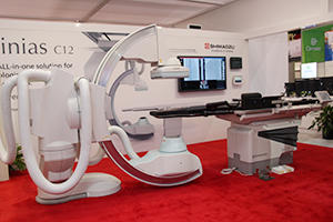 血管撮影装置は今回のRSNA 2016で,床置き式の「Trinias F12」を開発中のチルトテーブル(FDA,日本国内薬機法未承認)と組み合わせてアピールした。TriniasのCアームはフレキシブルな設計となっており,12インチFPDとあわせて全身領域の血管撮影をカバーすることができる。ハードウエアとアプリケーションの両面から高画質と低被ばくを追求した上位システムとして,日本と欧米をメインターゲットに展開している。併せて展示したチルトテーブルは,欧米で広く行われているCO2イメージングの効率的な実施を支援する。また今回,米国向け製品として,橈骨からアクセスする際に上腕を固定するアーム補助具をチルト寝台に備え付けて展示した。