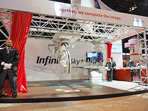 Toshiba America Medical Systems(東芝メディカルシステムズ)のアンベールイベントで最後に披露されたのが,血管撮影装置の「Infinix-i Sky +(日本では Infinix Celeve-i INFX-8000C)」である。天井懸垂型のCアーム(CAS-930A)を組み合わせることで,210度の広範囲のローテーションと高速回転(80度/秒)によって,短時間の息止めによる3D撮影が可能になった。これにより息止め時間の短縮や造影剤量の削減など,負担の少ない撮影を可能にする。また,天井走行型で自由度が高く,さまざまな周辺機器が設置されている検査環境でも,Cアームを使った回転撮影を可能にする。さらに,被ばく低減技術である“DoseRite”が搭載され,術中の被ばく線量をリアルタイムで表示する“DoseRite DTS(Dose Tracking System)”によって,被ばく低減を意識した検査,手技がサポートできることをアピールした。