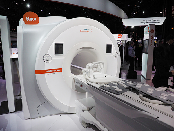 Siemens Healthineers(シーメンス)のMRIの目玉は,日本国内でも11月27日に発売開始がアナウンスされたハイエンドクラスの3T MRI「MAGNETOM Vida」である。ニューロサイエンス領域の研究用途にも対応した「MAGNETOM Prisma」のガントリを60cmから70cmへ拡大。新たな技術コンセプト“BioMatrix Technology”を搭載している。BioMatrix Technologyは,被検者の体格,年齢などの特性にかかわらず,高精度の画像を撮像する技術の総称であり,MAGNETOM Vidaを皮切りに,今後の新製品への採用が予想される。