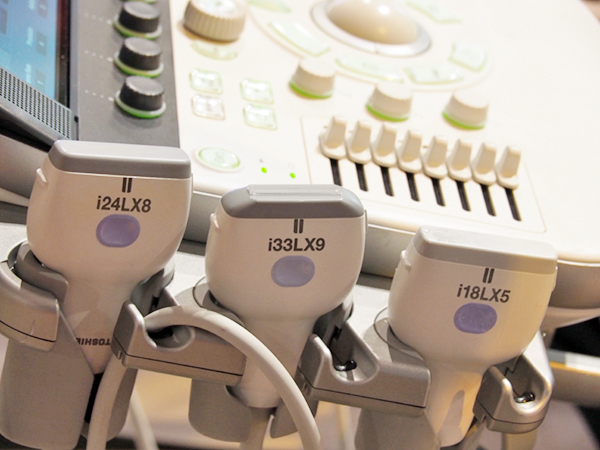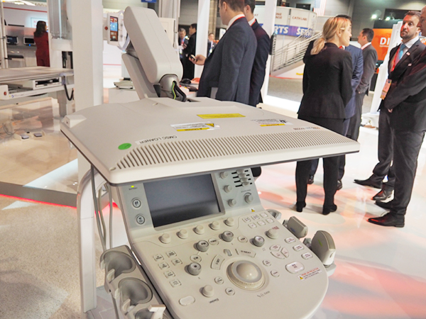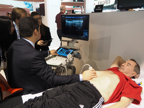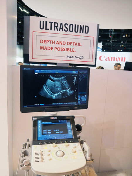 また,RSNA 2017の24MHz超高周波プローブに続いて,RSNA 2018に展示された33MHz高周波リニアプローブでは,表在や血管,整形外科領域で超高精細画像の描出が可能になったことをPRした。日本国内では2018年9月から発売を開始した。展示では,Aplio iシリーズを中心に,実機によるスキャンライブデモンストレーションが行われた。