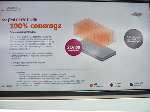 Siemens Healthineers(シーメンス)の核医学コーナーでは,前回参考出品された「Biograph Vision」が製品版となって登場した。日本国内では2018年11月1日に正式発表されている。Biograph Visionは高画質,効率性,被検者に優しい検査を高い次元で実現することをめざして開発された同社初のsilicon photo multiplier(SiPM)半導体検出器搭載のPET/CTである。