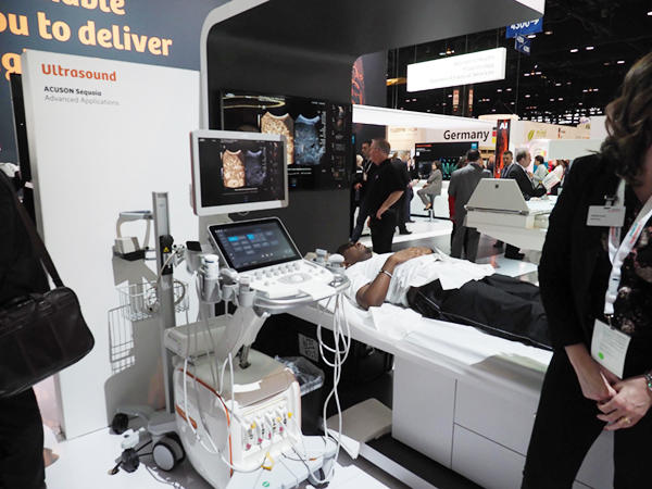 Siemens Healthineers(シーメンス)ブースのUSコーナーでは,プレミアムハイエンドクラスの「ACUSON Sequoia」が,RSNA会場に初めて登場した。日本国内では2018年10月26日に発表されたばかりの最新装置。ACUSON Sequoiaと聞いて,懐かしさを覚える方もいるかもしれないが,これはシーメンス超音波事業の前身であるアキュソン社の最上位機種と同じ名前である。かつての偉大な装置と同じ「Sequoia」の名が与えられたことからも,シーメンスの意気込みが伝わってくる。また,シーメンスは2017年にミドルクラスの装置として「ACUSON Juniper」を発表し(日本では2018年4月3日),以降,発売する新機種には木の名前を与えるとアナウンスしていたが,ACUSON Sequoiaはその第2弾となる。100m近くある巨木であるセコイアのように,シーメンスの超音波診断装置ラインアップの柱となる装置だと言えよう。