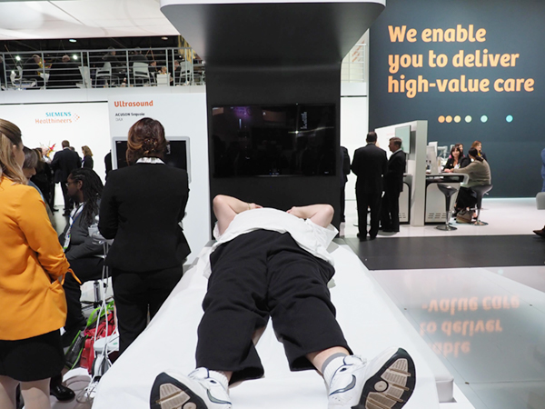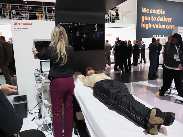 USのコーナーでは,3台のACUSON Sequoiaを使ったライブデモンストレーションを行い,“InFocus”技術の紹介や大きな体格の被検者での検査,造影超音波における高精度な画質などを実際に確認できるようにした。