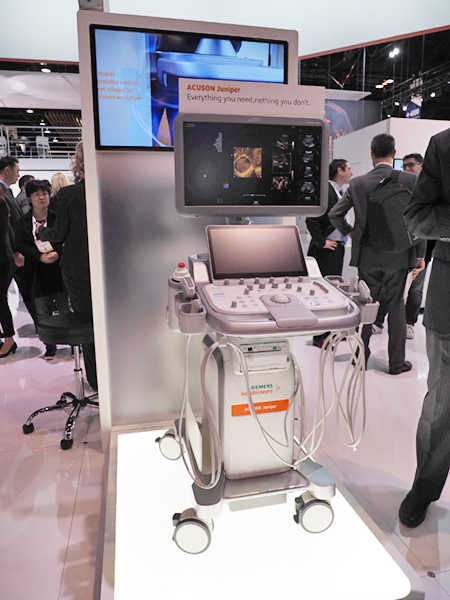 このほか,ACUSON Juniperも展示された。コンパクトな設置スペースとトランスデューサのラインナップにより,施設内でフレキシブルに運用できるほか,shear wave elastographyによる肝硬度計測の対応している。
