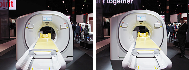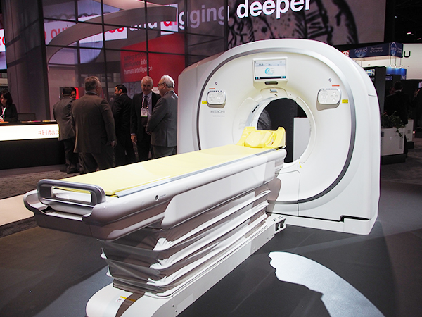 Hitachi Healthcare(日立製作所)のCTコーナーでは,64列128スライスCT「SCENARIA View」と,64列 / 16列マルチスライスCT「Supria」シリーズの2台のモックアップを展示し,最新アップデート情報と併せてアピールした。