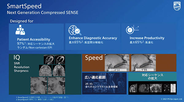 今回発売された“SmartSpeed”は,圧縮センシングMRIを使用した高速化技術“Compressed SENSE”に新開発のSmartSpeedエンジンを統合,97%のシーケンスに対応し,最大65%の高速化,高空間分解能化を実現する。また,適用範囲が拡大され,MultiVaneやEPI-DWI,金属アーチファクト低減技術“O-MAR”などへも適用可能となった。日本では未発売だが,発売後は全機種に対応する予定である。