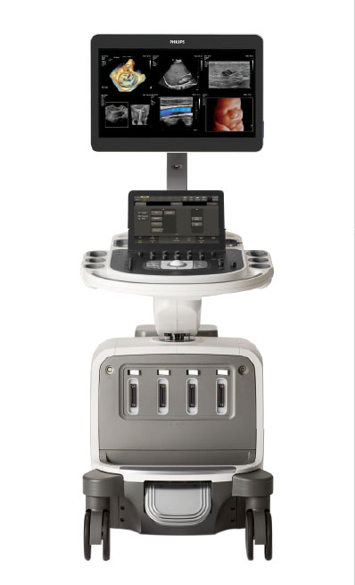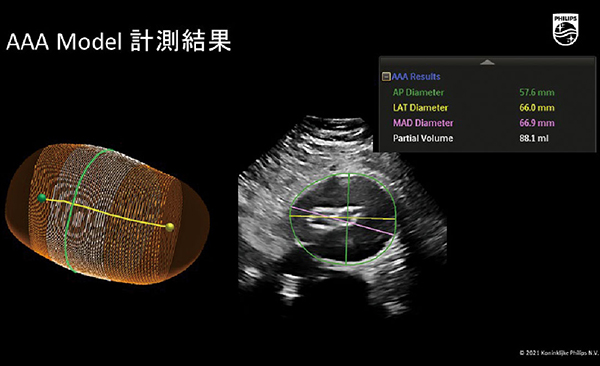 Philips(フィリップス)の超音波装置「EPIQ Elite」は,腹部や表在,乳腺,産婦人科など幅広い領域に対応する。2019年発売のxMATRIXトランスデューサ「XL14-3」は,1本で2D/3D/4Dの画像を表示できる世界初のリニアマトリックスプローブで,約5万6000個の素子が格子状に配列されている。リアルタイム2断面表示が可能で,血管の長軸と短軸を完全に同期した状態で表示,エコーガイド下末梢動脈治療(EVT)時などに有用である。また,3Dデータから腹部大動脈瘤を3Dモデル化して計測する“AAA Model”は,血管軸に垂直な断面を再構成して自動計測するため,2DよりCTに近い結果が得られる。