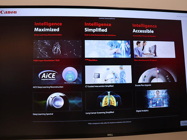 キヤノンメディカルシステムズのCT関連では,AIブランドAltivityの下に開発された超解像技術とノイズ低減技術,そして被ばく低減技術を中心に先進のCT技術を紹介した。ディープラーニングを応用した超解像画像再構成技術「Precise IQ Engine(PIQE)」は,高精細CT「Aquilion Precision」のデータで学習したdeep convolutional neural network(DCNN)により,ADCT「Aquilion ONE」などの通常解像度の画像を高精細化することができる。展示ではPIQEを用いた臨床画像を供覧し,プラーク評価における有用性や冠動脈ステントの視認性の向上をアピールした。現在は心臓領域で最適化されたDCNNが搭載されており,今後は他部位への展開も期待されている。