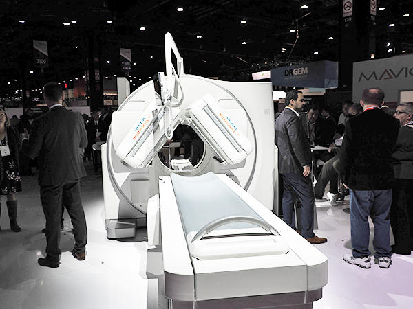 Siemens Healthineers(シーメンス)の核医学関連では,2022年9月7〜11日に京都府で行われた世界核医学会のタイミングで発表されたSPECT/CT「Symbia Pro.specta」が展示された。CTには,32スライスの「SOMATOM.go」を採用。Tin filterを搭載しており,被ばくの低減を図れる。近年注目されるセラノスティクス(核医学治療)では,SPECT/CTを複数回撮像するため,被ばく線量を抑える必要がある。CTをSOMATOM.goにしたことにより,被ばく線量を抑えた治療を施行できる。一方,SPECTはリストモード収集が可能となり,自動での体動補正やデバイスを用いずに呼吸同期撮像を行える。このほかにも,被検者のポジショニング,画像再構成などの操作を支援する「myExam Companion」を搭載しており,質の高い検査を効率的に施行できるようになった。