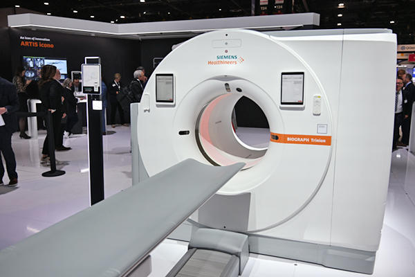 Siemens Healthineers(シーメンス)は核医学装置としては,日本国内でも2024年11月6日から販売が開始された半導体検出器搭載PET/CT「Biograph Trinion」が展示された。シーメンスとしては初となる空冷式の半導体検出器を採用。これにより,239ピコ秒という高いTOF時間分解能を実現しており,高速撮像で高画質画像を取得することができる。検査時間の短縮にもつながり,被検者の被ばく線量を低減することが可能である。また,空冷式を採用したことで,水冷式で必要となるチラーの設置が不要になる。加えて,コンピュータをガントリに収めることで,機械室も確保する必要がない。このため設置面積をコンパクトにできるというメリットもある。さらに,夜間に電源を切り,翌朝に自動で起動する省電力モードにより,電力使用量を最大65%削減可能だ。