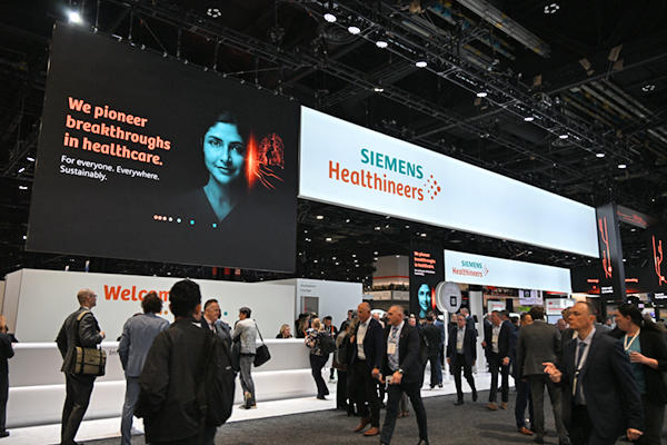 Siemens Healthineers(シーメンス)は,“We pioneer breakthroughs in healthcare. For everyone. Everywhere. Sustainably.”というパーパスを掲げて出展した。サウスビルディングで最も面積の広いブースを構え,まさに「南の横綱」と言える存在感を示した。存在感を示したのは広さだけではない。パーパスにあるとおり,技術革新を続け,医療の新たな可能性を切り開いてきたシーメンスだけに,ブース内は新製品ラッシュとなった。