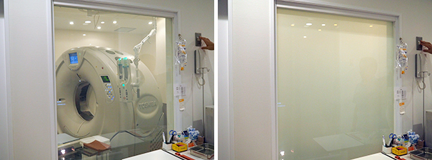 世界初の鉛入りの調光ガラスを採用したCT検査室(右が遮光時)