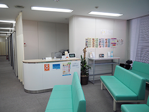 特徴的なデザインのビルの1階に検査部門,4階に診療部門