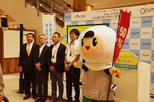 講演者とがん検診受診率50%達成に向けたイメージキャラクター |