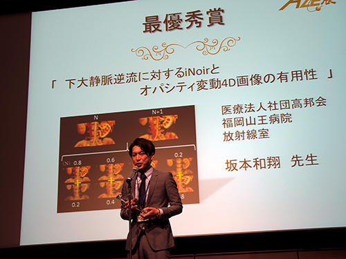 最優秀賞は,坂本和翔氏(医療法人社団高邦会福岡山王病院放射線室)の「下大静脈逆流に対するiNoirとオパシティ変動4D画像の有用性」が受賞した。坂本氏は2018年に続き,2年連続の最優秀賞受賞となった。受賞作品は,ADCTを生かした撮影体位の工夫や低線量撮影でのノイズ低減ソフトウエアの活用,オパシティ変動を利用した4D画像作成による視覚的連続性の向上などの取り組みにより,下大静脈逆流評価を可能にしたもの。講評では,「さまざまな機能・工夫が凝縮されており,日常臨床での努力が見られる」と,今後もさまざまにワークステーションを活用できると期待させるものであると評価された。