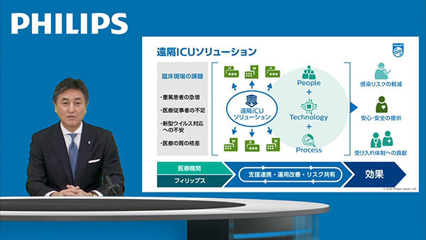 (株)フィリップス・ジャパンは2020年4月28日(火),新型コロナウイルス感染症(COVID-19)の拡大防止に向けてフィリップスが提供する,医療機器やサービスなどのヘルステック・ソリューションに関するプレスセッションをオンラインで開催した。セッションでは代表取締役社長の堤 浩幸氏が登壇し,フィリップスの新型コロナウイルスへの対応や,新型コロナウイルスに対応する医療機関や自治体に提供可能な医療機器やサービスについて説明した。