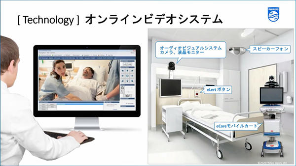 ICU現場には,高精細カメラやモニタ,スピーカーフォン,支援センターを呼び出せる”eLertボタン”などが設置され,オンラインビデオシステムにより,支援センターからは映像情報による患者や機器の状態把握や,双方向音声によるコンサルテーション,バーチャル回診などを行うことができる。これらを活用することで,集中治療現場に対してより早期に,効率的・効果的な介入が可能になることに加え,集約されたデータを基にしたレポーティングソリューションにより臨床的アウトカムを評価し,運用改善に役立てることもできる。