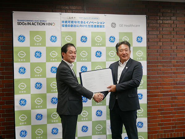 GEヘルスケア・ジャパン(株)は,本社所在地である東京都日野市と,「持続可能な社会とイノベーション創出に向けた包括連携協定」を締結した。2020年9月25日(金)には,日野市役所において,多田荘一郎代表取締役社長兼CEOと大坪冬彦市長が出席し,協定式が行われた。