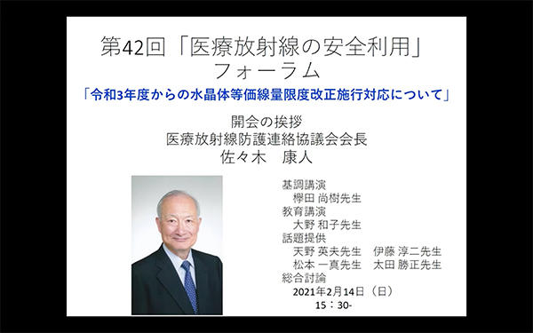 医療放射線防護連絡協議会は2021年2月,「令和3年度からの水晶体等価線量限度改正施行対応について」をテーマに,第42回「医療放射線の安全利用」フォーラムを開催した。同フォーラムでは,第40回(2019年),第41回(2020年)の2回にわたり,水晶体の等価線量限度改正に伴う医療現場の対応について検討を行ってきた。今回は,電離放射線障害防止規則が2021年4月1日に一部改正されるのを前に,水晶体の線量限度改正に関する基調講演のほか,同協議会も編集に参画した「医療スタッフの放射線安全に係るガイドライン」の紹介や関連学会からの話題提供,提言策定に向けた総合討論が行われた。2020年12月の第31回「高橋信次記念講演・古賀佑彦記念シンポジウム」に続くオンラインでの開催となり(事前登録制で,視聴期間は2月12~19日),総合討論のみが2月14日(日)にZoomによるLIVE中継で行われた。