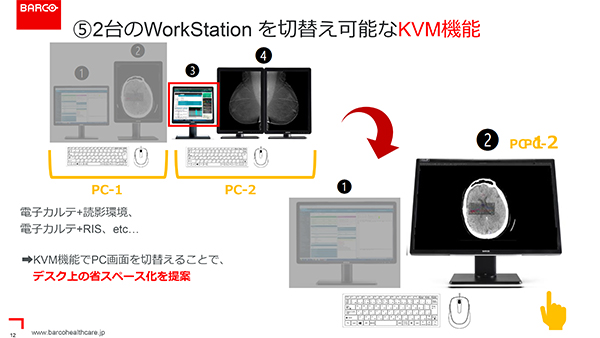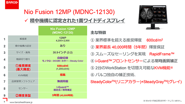 増子氏はまず,ベゼルレスの優位性として,読影時の頭や手,目の動きを最小限に抑える上,マルチモダリティ画像を1画面に表示できることから,画像診断の快適性の向上が期待されるとした。また,Nio Fusion 12MPの特徴として,キャリブレーション推奨輝度600cd/m2や4万時間(5年間)の輝度保証など,同社の既存製品に共通する優位性に加え,新たに搭載された各機能などを挙げた。