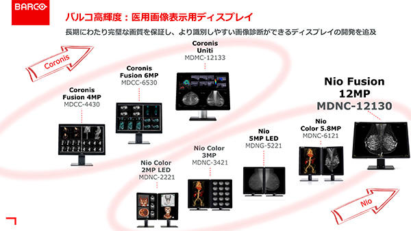 バルコ(株)は2021年4月6日(火),1月に発売した医用画像表示ディスプレイ「Nio Fusion 12MP」を紹介するウェビナーを開催した。Nio Fusion 12MPは,仕切りのない(ベゼルレス)30.9インチのワイド画面を採用。2つのワークステーション間でビデオとUSB接続の両方のデバイス切り替えが可能なKVM機能により,複数台のディスプレイを使用する必要がなくなるほか,同社独自の技術やセンサーを搭載し,画面表示環境を向上させている。ウェビナーでは,同社ヘルスケア事業部メディカルイメージングチームの増子由康氏が,同社製品群におけるNio Fusion 12MPの位置づけや性能について紹介した。