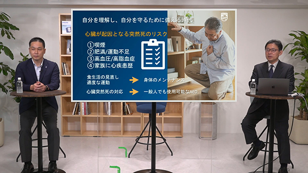基調講演に続いて,武田氏とフィリップス・ジャパン コネクティッドケア事業部 救急救命士の成川憲司氏がトークセッション「これからのNew normal life」を行った。日常が非日常に変わったコロナ禍における個人や病院への影響,心因性の突然死のリスクなどに触れ,New normal lifeとは自らを守るために備える時代であるとして,身近な心臓突然死への備えの大切さを訴えた。