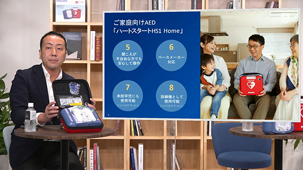 最後に,家庭向けAEDハートスタートHS1 Homeについて,コネクティッドケア事業部エマージェンシーケア部長の藤戸慶一氏が製品説明を行った。ハートスタートHS1 Homeは軽量(1.5kg)・コンパクトなAEDで,未就学児への使用も可能な低エネルギーの除細動にも対応する。音声ガイドや聞こえが不自由な方も操作可能なガイダンスの搭載や,訓練機としての使用,ペースメーカーへの対応など,使いやすさが特長となっている。救急の日の9月9日(木)より,Amazon(売り切り),ダイバーシティメディア(https://www.diversitymedia.jp