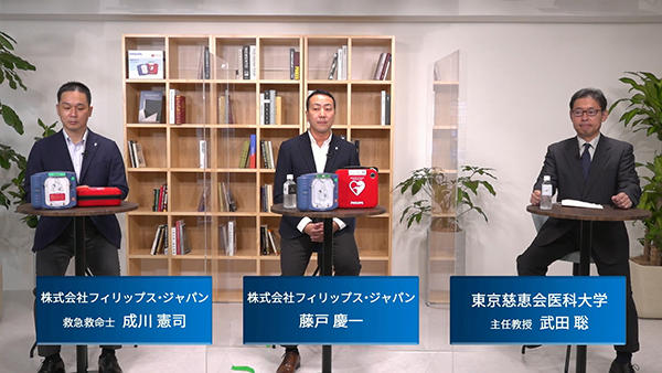 (株)フィリップス・ジャパンは2021年9月1日(水),「防災の日プレスセッション—防災の日に見直す,日々の暮らしに安心を。」をオンラインで開催した。日々の生活におけるリスクとして,多くが住宅で発生している心肺停止をテーマに基調講演やトークセッションが行われた。フィリップス・ジャパンは,心肺停止からの社会復帰率“世界一”の実現をめざすHeart safe city構想の下,自治体や大学,企業などのパートナーとAEDの適正配置やファーストレスポンダー(救急隊に引き継ぐまで適切に応急手当ができる救護者)の育成サポート,救援アプリに連動した「SOSボタン」の提供などの取り組みを進めている。2021年初めには医師の処方なしで購入可能な家庭向けAED「ハートスタートHS1 Home」を発表しており,この日,9月9日(木)より予約開始することがアナウンスされた。