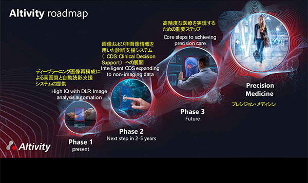 Altivityが医療現場にもたらす価値として,キヤノンメディカルシステムズはさらなる臨床価値(Informed healthcare),経営価値(Fast, tailored care),運用の価値(Efficient workflows)の創造の3つを掲げる。これらに対して,高精細画像などで診断や治療方針決定の支援(臨床価値),迅速で正確な診断結果の提供を可能にするAIソリューションで,患者中心のオーダーメイド医療や早期退院などを支援し病院経営への貢献(経営価値),AIドリブンのワークフローでオペレーションや人材などの医療資源の最適化(運用価値)などを可能にしていく。AltivityのもとでのAI提供は,段階的な進化によるロードマップを想定している。最終的な目標はプレシジョン・メディシン(個別化医療)の提供だが,Phase1は現在で,すでにAiCEやAbierto Reading Support Solution(RSS)などの自動読影支援システムなどを提供している。次のステップ(Phase2)が,画像および非画像情報を用いた診断支援システム(Clinical Decision Support:CDS)への展開で,今後2年から5年をめどに進める。さらにその先(Phase3)は,それまでの知見を集約してAIを活用した高精度な医療(precision care)を実現すると瀧口社長は説明した。