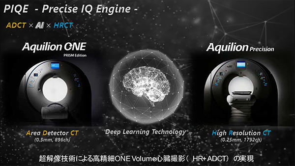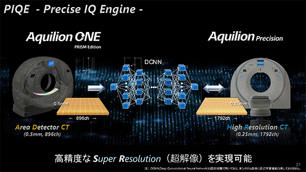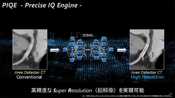 また,会見ではAltivityの基で展開されるAI技術の第1弾として,320列Area Detector CT「Aquilion ONE / PRISM Edition」に新たに搭載されるディープラーニングを応用した超解像画像再構成技術“Precise IQ Engine:PIQE(ピーク)”についても発表された。PIQEは,超解像(Super Resolution)を用いて構成したdeep convolutional neural network(DCNN)による画像再構成によって従来のADCTの画像の高分解能化を図る技術である。