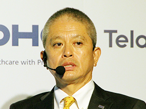 発表会では,PHCホールディングス(株)代表取締役社長CEOのジョン・マロッタ氏からのビデオメッセージによる挨拶に続き,PHCホールディングス(株)執行役員兼ヘルスケアソリューション共同ドメイン長,PHC(株)メディコム事業部事業部長の大塚孝之氏が登壇し,事業戦略と新製品の位置づけについて紹介した。メディコム事業部は,国内で大きなシェアを占めるレセプトコンピュータ,電子カルテシステム,電子薬歴システムの展開に加え,2021年10月から本格運用が開始されたオンライン資格確認も強力に推進している。大塚氏は,メディコム事業部では次の成長領域として遠隔医療を見据えていると述べ,コロナ禍で普及したオンライン診療をさらに一歩進め,医師と医師(DtoD),また看護師を通じて医師と患者(DtoPwithN)がつながる遠隔医療を提供していくと展望した。また,2021年1月から現在までに300万回の利用実績があることに触れ,パンデミックにより対面が制限される今こそ必要なソリューションであると締めくくった。