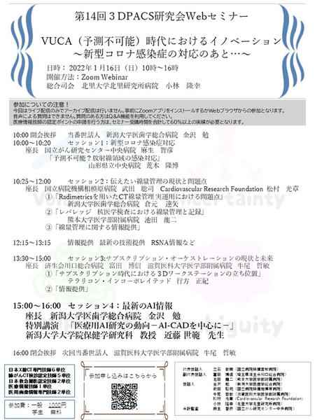 2022年1月16日(日),第14回3D PACS研究会がWebセミナーとして開催された。新型コロナウイルス感染症(COVID-19)のパンデミックの影響を受け,前回に続き実地開催を見送り,Web形式で行われた今回,テーマには,「VUCA(予測不可能)時代におけるイノベーション〜新型コロナ感染症の対応のあと…〜」が掲げられた。開会に当たり挨拶した当番世話人の金沢 勉氏(新潟大学医歯学総合病院)は,オミクロン株によるCOVID-19の急速な拡大は,今回のテーマにあるVUCA時代を象徴しているとし,このような時代において,アフターコロナの放射線診療を考える機会にしたい述べ,バラエティに富んだプログラムを構成したと説明した。プログラムは,セッション1「新型コロナ感染症対応」,セッション2「伝えたい線量管理の現状と問題点」,セッション3「サブスクリプション・オーケストレーションの現状と未来」,セッション4「最新のAI情報」で構成された。なお,総合司会は小林隆幸氏(北里大学北里研究所病院)が務めた。